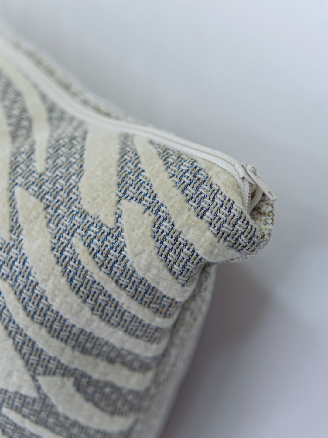 A capa de almofada decorativa creme e cinza da LeCamaleon destaca-se pelo seu padrão ondulado suave, que cria um efeito visual elegante e contemporâneo. As linhas curvas, visíveis nas imagens, conferem movimento ao tecido e tornam esta almofada ideal para ambientes modernos, minimalistas ou de inspiração natural.